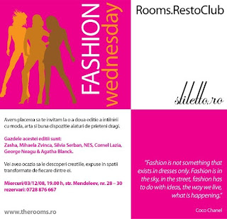Fashion Wednesday Rooms RestoClub, miercuri 03/12/08, 19.00 h, str. Mendeleev, nr. 28-30. Share this:Click to share on Facebook (Opens in new window)Click to share on Google+ (Opens in new window)Click to email this to a friend (Opens in new window)Click to share on Pinterest (Opens in new window)