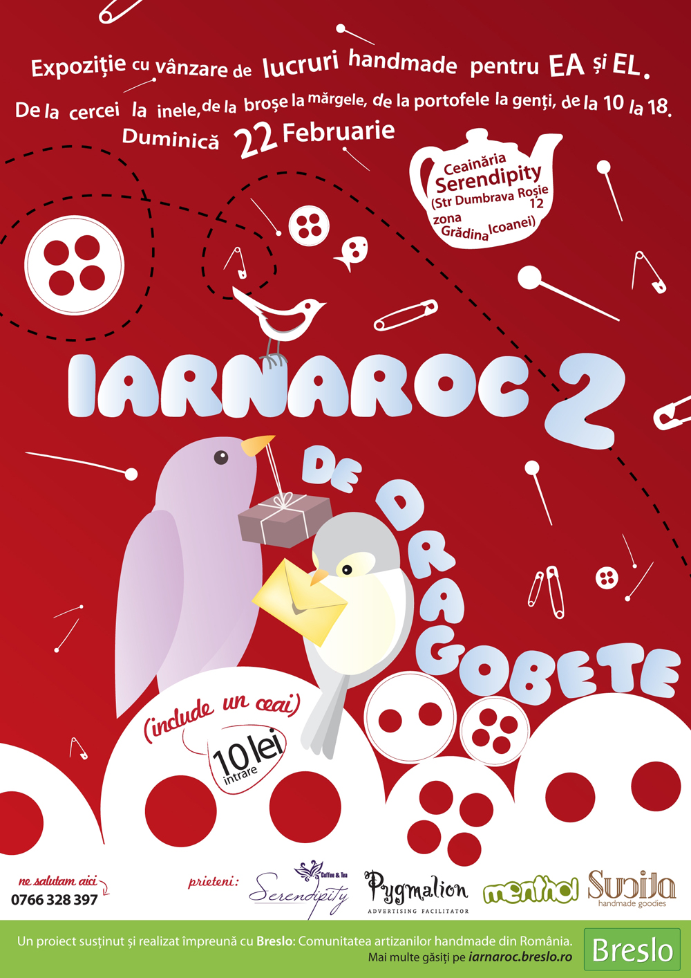 Bucureşti, 18 februarie 2009: Duminică, 22 februarie 2009, puţin înainte de Dragobete, ziua românească a îndrăgostiţilor, îţi poţi găsi perechea potrivită de cercei şi nu numai, la a 2-a ediţie a IARNAROCULUI. La IARNAROC de Dragobete vizitatorii şi expozanţii se vor strânge în jurului unei expozitii de obiecte lucrate manual cu o cană de ceai aromat în mână. Târgul va avea loc la ceainăria Serendipity, în apropierea parcului Grădina Icoanei, între orele 10.00 şi 18.00.