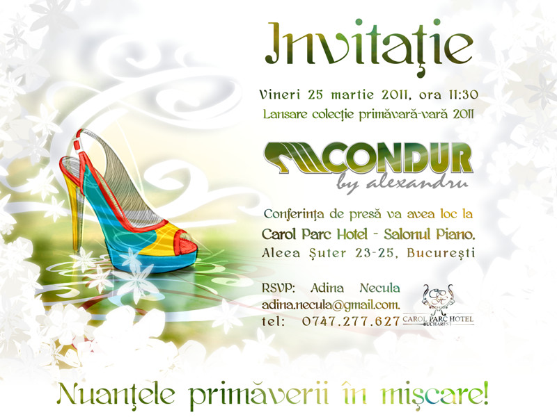 Lansare colectie SS Condur by alexandru 2011 Vineri, 25 martie, la ora 11.30, are loc evenimentul de lansare al colectiei primvara-vara 2011 CONDUR by alexandru, ce va avea loc la Carol Parc Hotel – salonul Piano. Share this:Click to share on Facebook (Opens in new window)Click to share on Google+ (Opens in new window)Click to email this to a friend (Opens in new window)Click to share on Pinterest (Opens in new window)