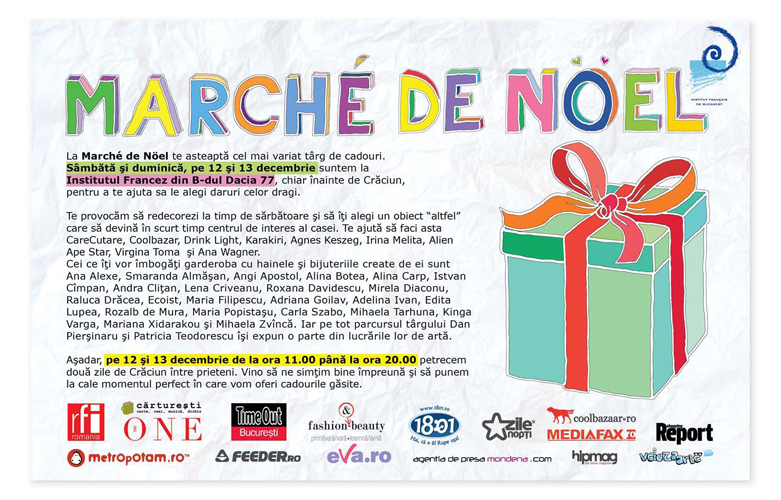 Pe 12-13 decembrie are locul alt targ de cadouri, cu ocazia sarbatorilor de Craciun, intitulat putin cam pretios “Marche de Noel”. Evenimentul se petrece la institutul francez timp de 2 zile si participa multi designeri interesanti, printre care: CareCutare, Karakiri, Rozalb de Mura, Mihaela Zvanca si multi altii pe care puteti sa-i cititi in posterul afisat.
