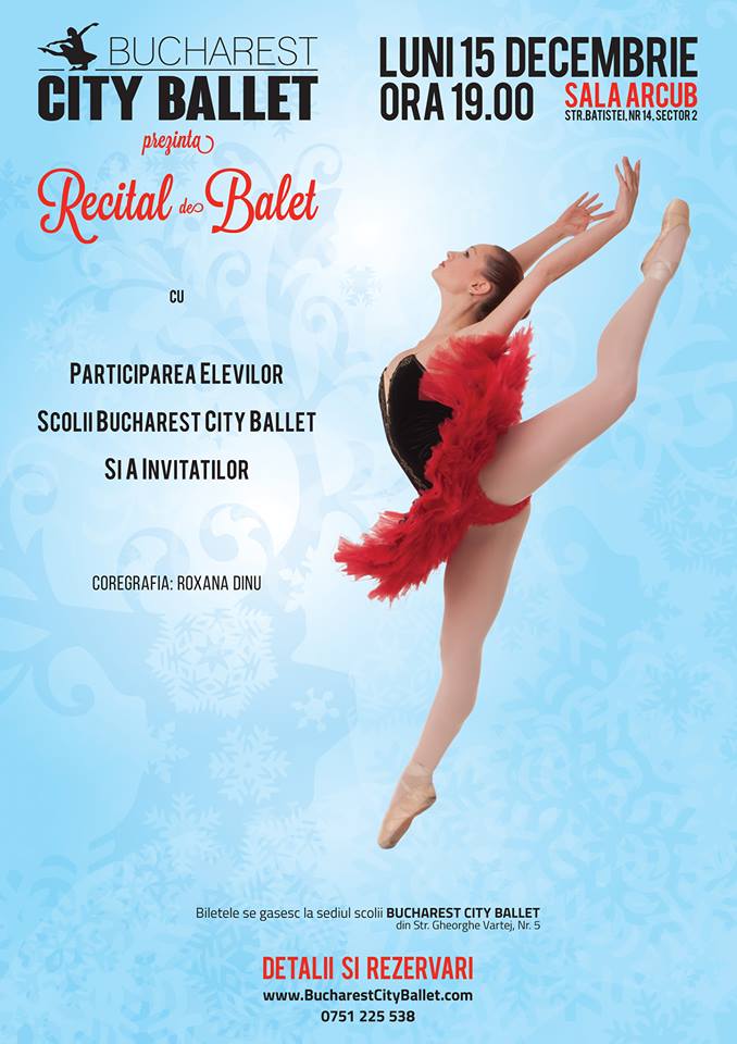 Doamne! Pe 15 decembrie, adica peste o saptamana si un pic, balerina mea favorita va fi pe scena. Si nu orice fel de scena, ci una din buricul targului, la sala Arcub, unde elevii scolii de balet Bucharest City Ballet vor sustine un Recital de Balet. Toate grupele, de la cele mici – miculine asa ca L meu mare, vor evolua, ca sa ma exprim pretios, sub indrumarea balerinei coregraf Roxana Dinu.