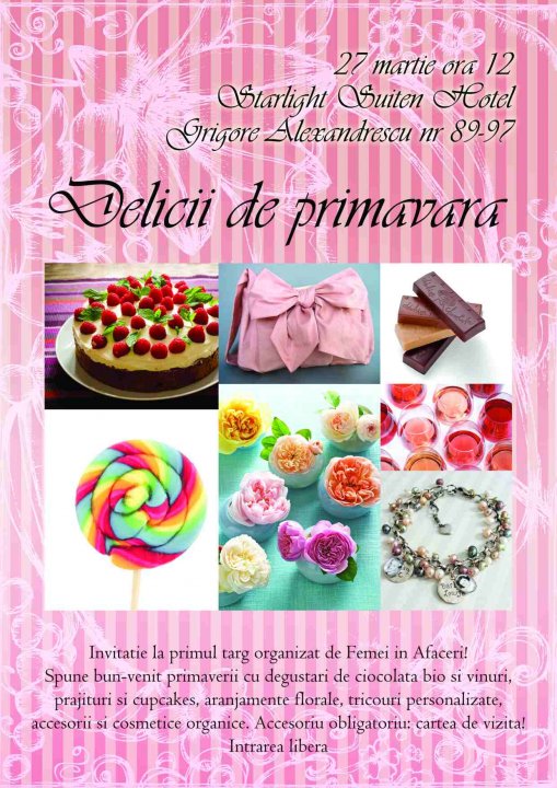 Sambata, 27 martie, va avea loc targul cu Delicii de primavara, fiind primul targ organizat de Femei in afaceri, nu va speriati ca nu fac parte, dar mi-a placut continutul si ideea acestuia. Acolo veti putea degusta tot felul de bunatati, de la ciocolata cu mamaliga la vinuri alese si veti putea cumpara cosmetice organice sau hainute – va fi prezenta Cristina Zegrea – si accesorii. Totul se va petrece in incinta hotelului Starlight Suiten, de pe str. Grigore Alexandrescu 89-97 (eu habar n-am unde este) iar intrarea este LIBERA.