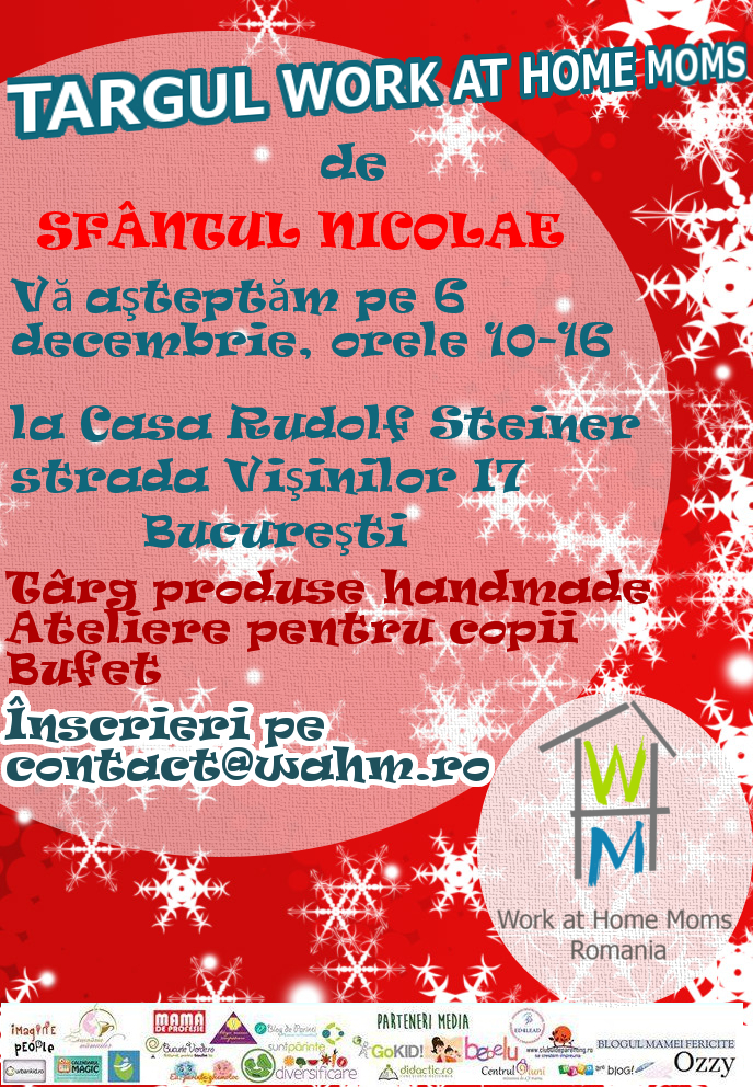 Dragii mei, pe 6 decembrie care pica intr-o sambata, se intampla ceva frumos la sediul WAHM, casa Rudolf Steiner din strada Visinilor. Pentru ca este o sfanta sarbatoare si pentru ca toti copiii asteapta sa primeasca ceva de la Mos, mamele de la WAHM pregatesc un targ cu produse handmade speciale pentru Sf. Nicolae. Intr-o atmosfera de sarbatoare, mamicile vor expune produse si vor prezenta servicii minunate. Totul creat cu dragoste si mult dichis.